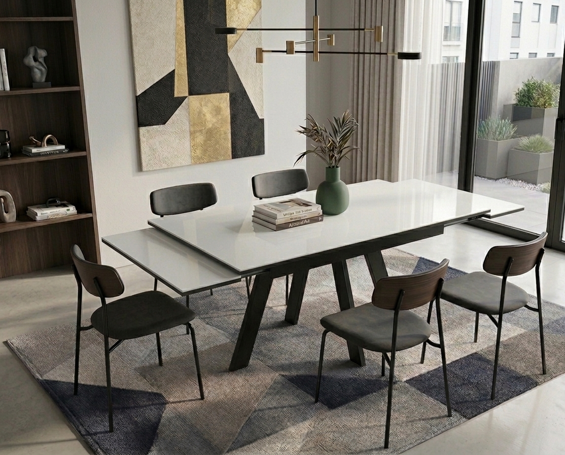 Стол ТРС 120 — это идеальное решение для современной кухни или гостиной. Сочетание белоснежной глянцевой столешницы и графитовых V-образных опор создает визуальную легкость, а надежный механизм трансформации делает его по-настоящему универсальным.
